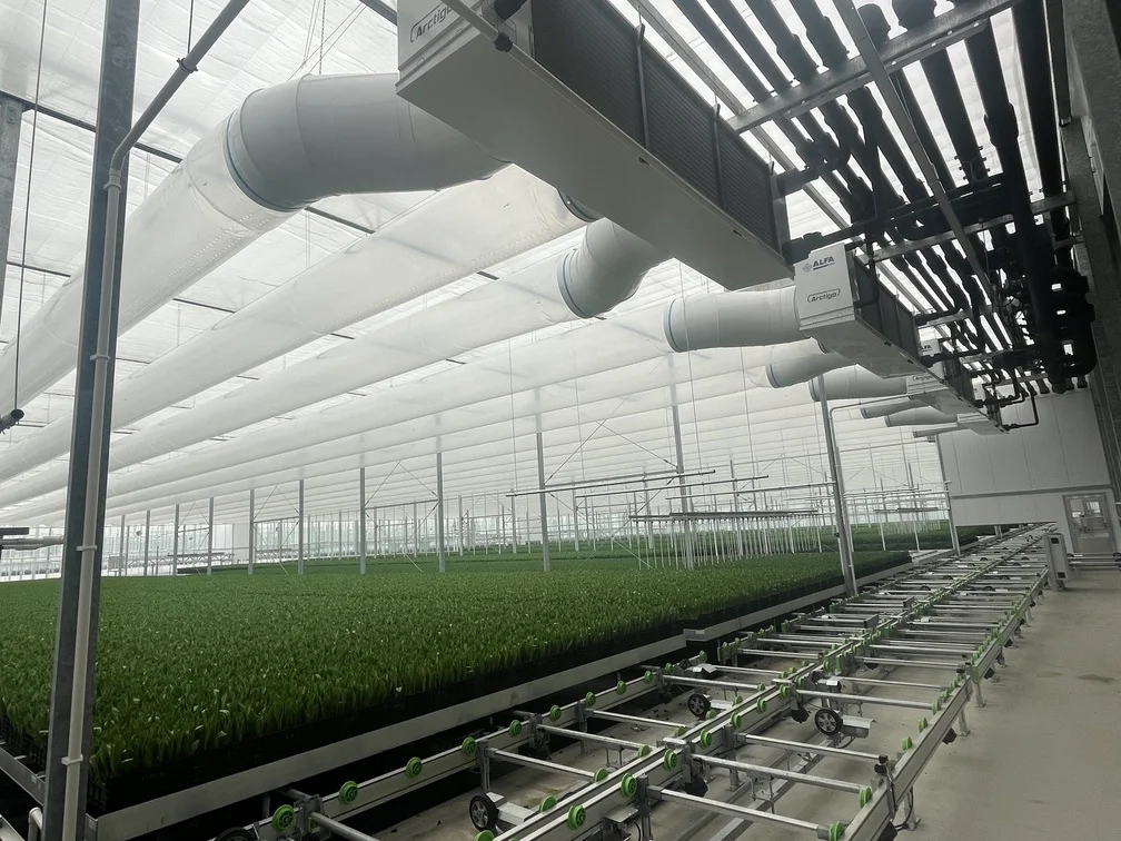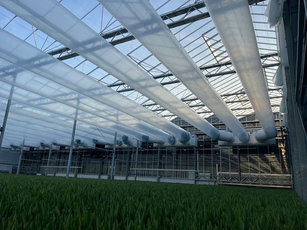 Jaarrond tulpenproductie met geïntegreerde koeling en ontvochtiging. Restwarmte van de koelinstallatie wordt hergebruikt voor verwarming. Aanvullende warmte wordt geleverd via een hoogrendement ketel.